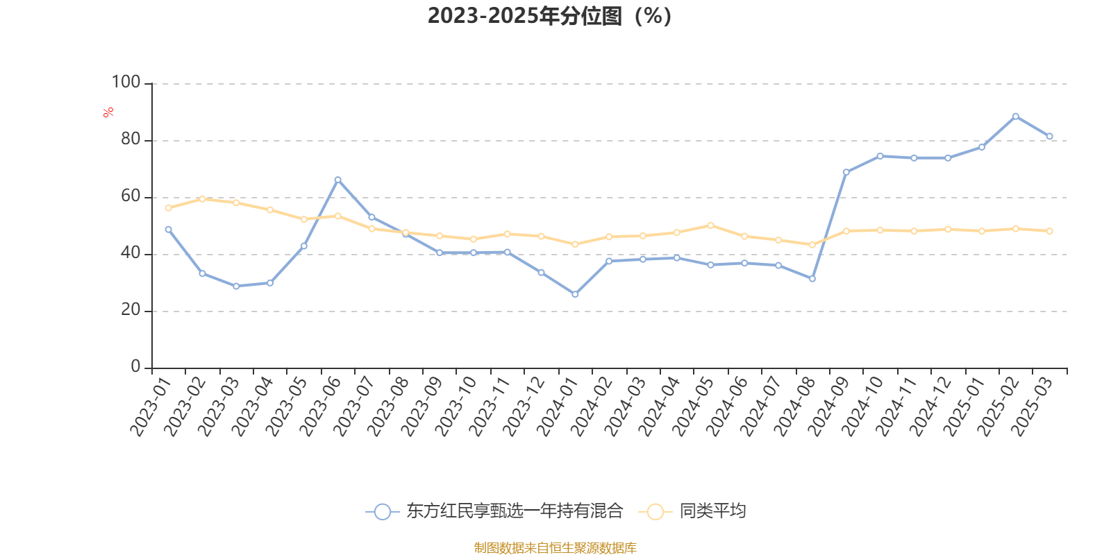 通过所选区间该基金净值增长率分位图,可以观察该基金与同类基金业绩比较情况。图为坐标原点到区间内某时点的净值增长率在同类基金中的分位数。